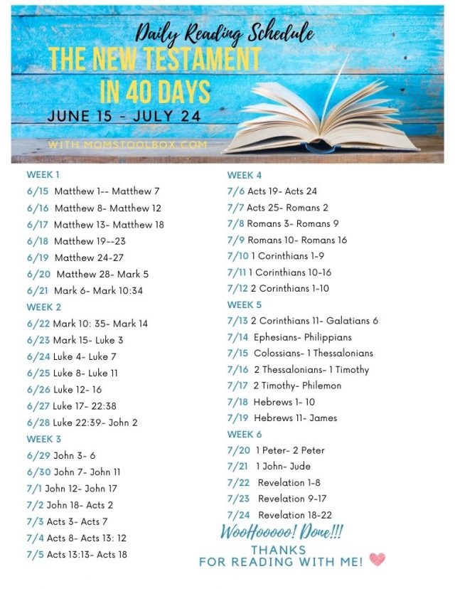 - Download a copy of the New Testament on 40 Days reading schedule