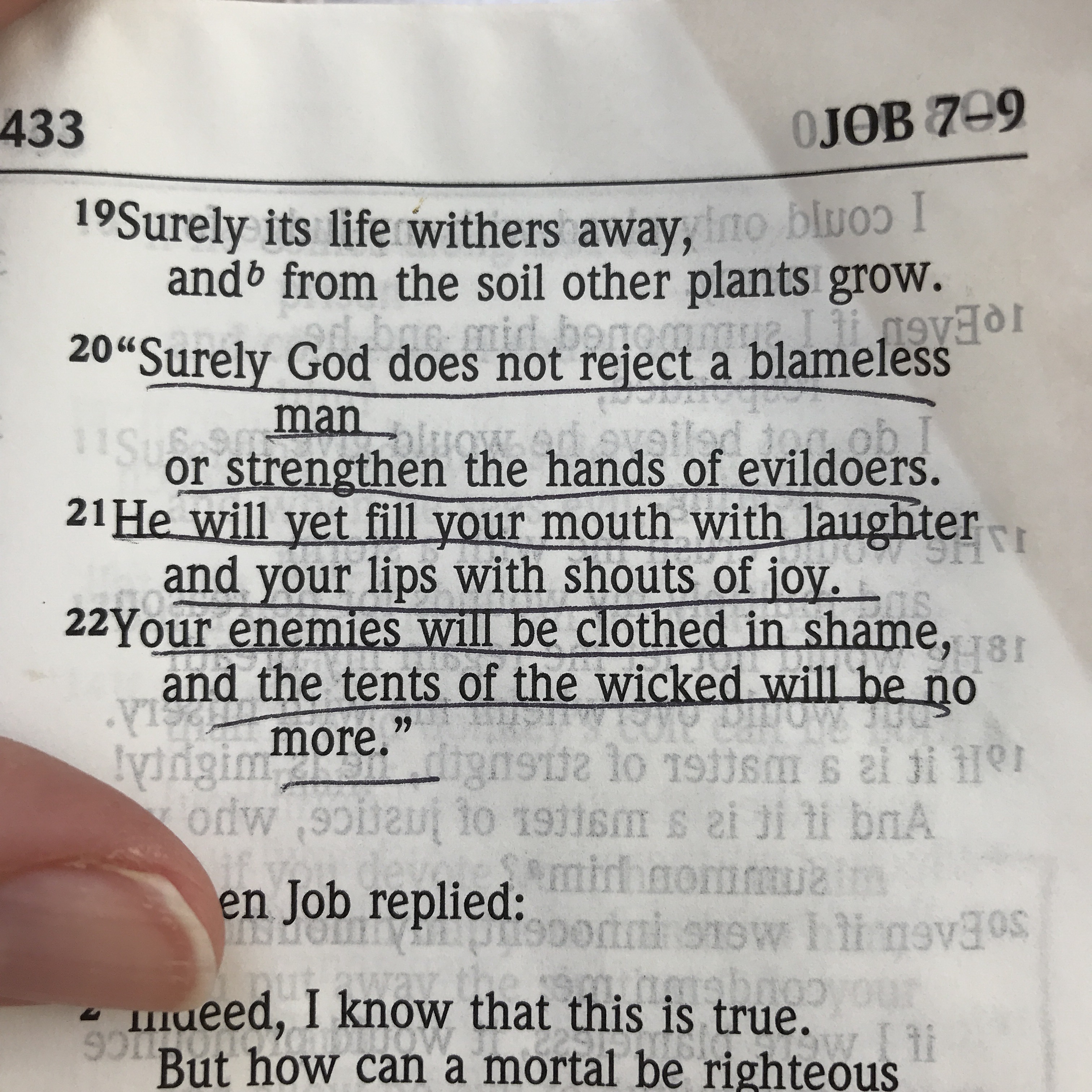 20 “Surely God does not reject a blameless man or strengthen the hands of evildoers. 21 He will yet fill your mouth with laughter and your lips with shouts of joy. 22 Your enemies will be clothed in shame, and the tents of the wicked will be no more”